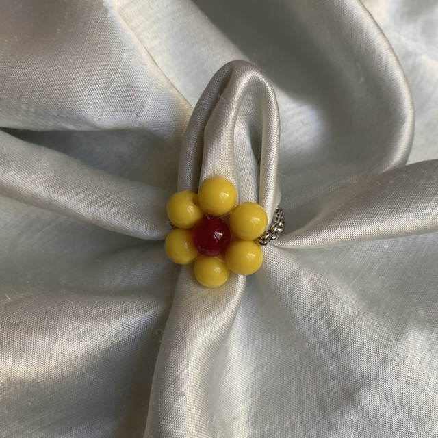 - Couleur : chaîne argentée, perles jaunes et rouge.