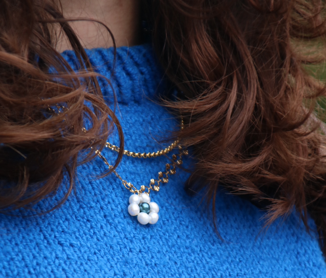 - Couleurs : chaîne dorée, perles tons blanc et bleu marine nacrés.