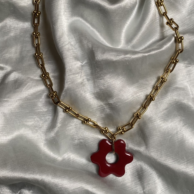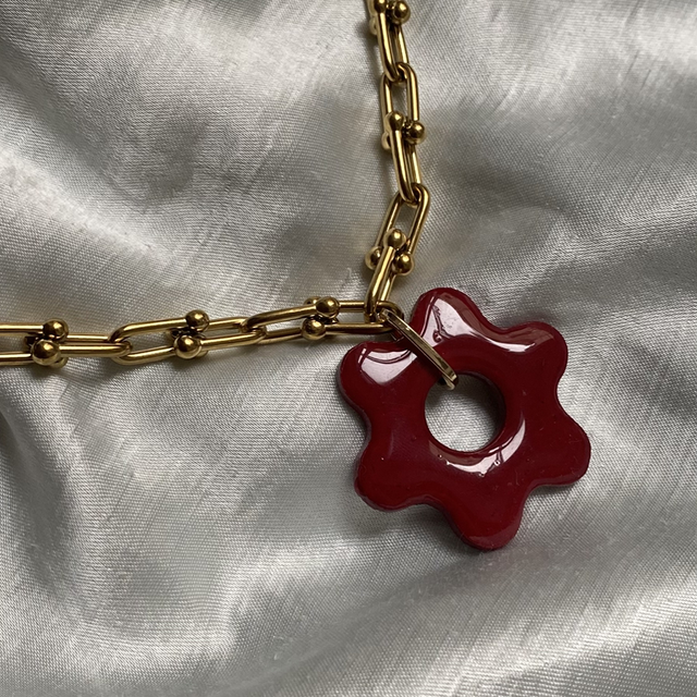 - Couleur : chaîne dorée, fleur bordeaux foncé.