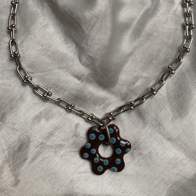 La fleur est en argile naturelle moulée, peinte et résinée à la main et la chaîne est en acier inoxydable neuf.