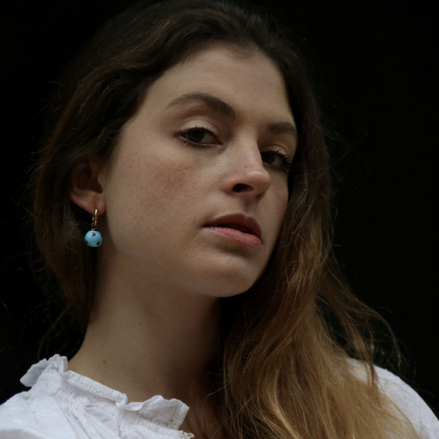 Les perles sont en verre, chinées à la pièce et tissées à la main. Les créoles sont en acier inoxydable neuf.