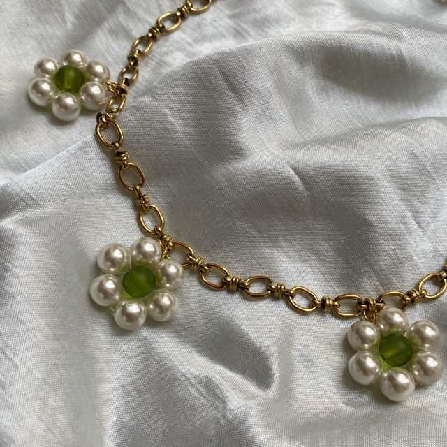 • Couleurs : chaîne dorée, perles nacrées et vertes.